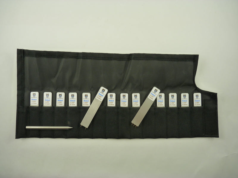 Specially designed for rebuilders. This beautiful set of 15 punches is most convenient when replacing the bridge capping in a used piano. Includes 7 double pointed punches for bi-chords, 7 triple-pointed punches for tri-chords and one punch for the single string. Very sharp laser cut from solid stainless steel. Measurements specially made to match most popular piano brands. Includes a handy cloth and a velcro carrying pouch.
