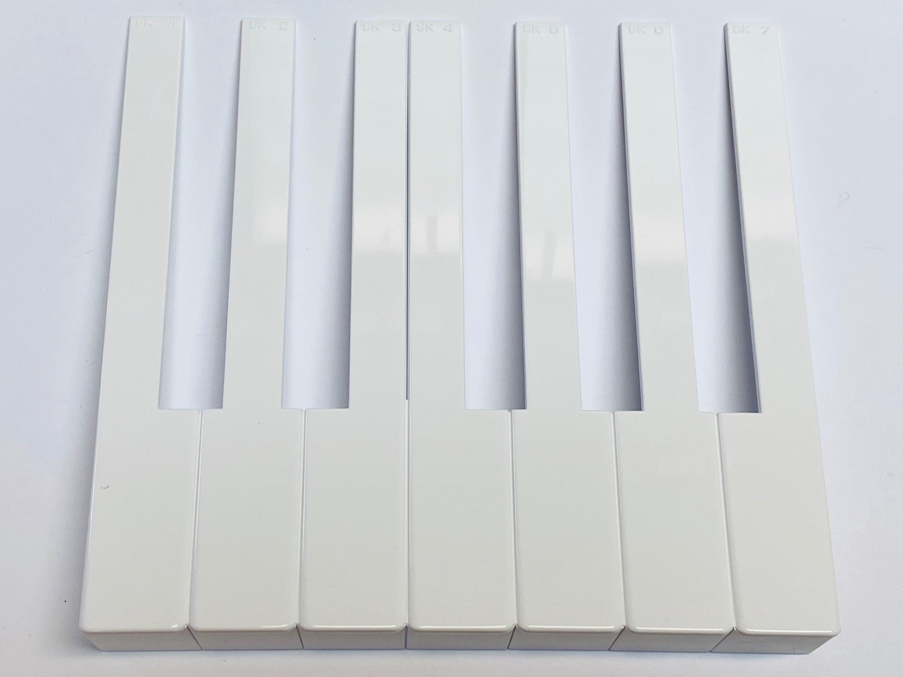Recouvrement de touches de clavier acryliques larges et pré-arrondies de 0,075" (1,9 mm) avec des faces de 0,069" (1,75 mm) attachées. Sections d'octave. Blanc. La tête mesure 29/32" (23 mm) x 2" (51 mm) de long.