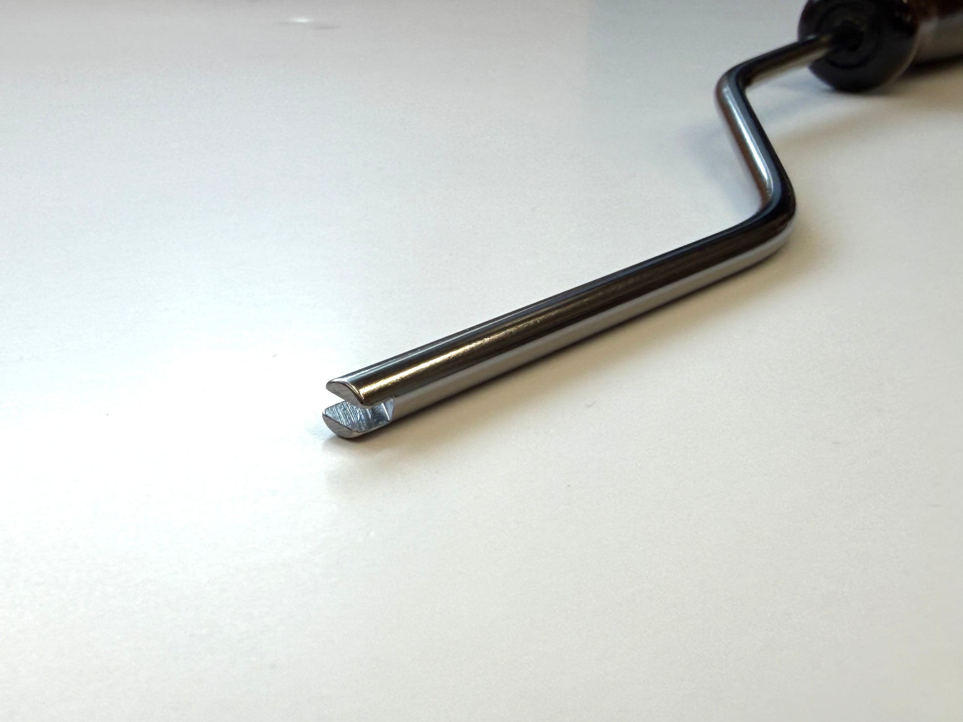 Designed for Steinway grand damper regulation or for similar damper mechanisms. Special design allows easy adjustment for wire at damper head. Tempered steel tip. With wooden handle. A high quality tool.