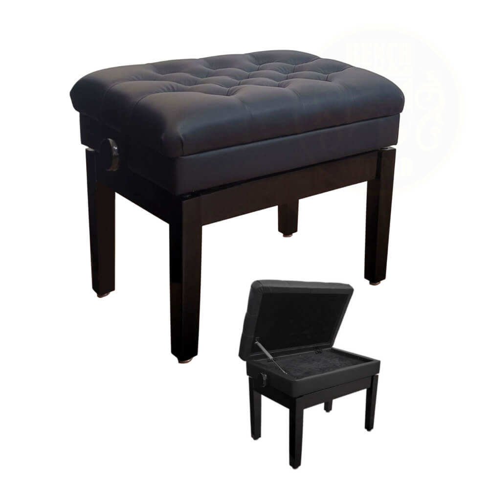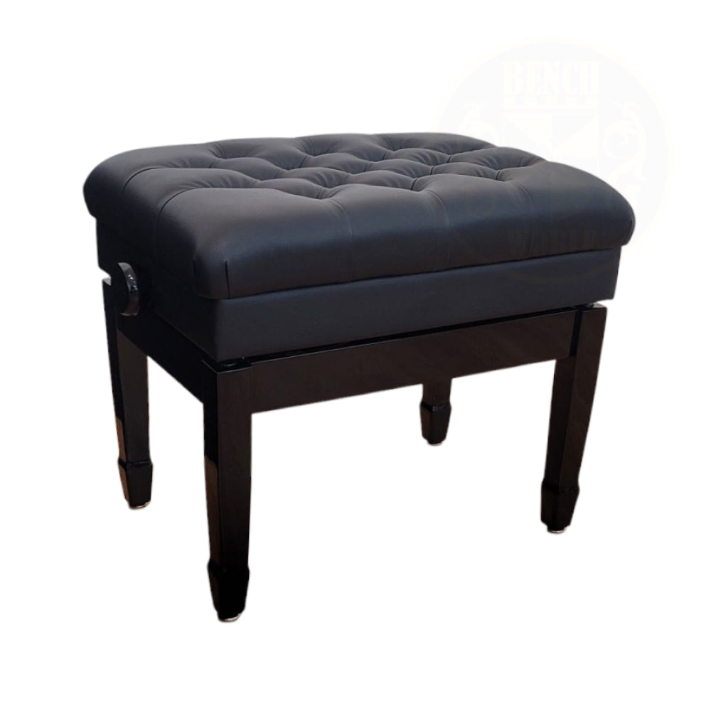 The bench is finished in a polished ebony. All sides and the legs are made from solid wood, and dried for 6 months prior to production to prevent the wood from warping or cracking in the future.