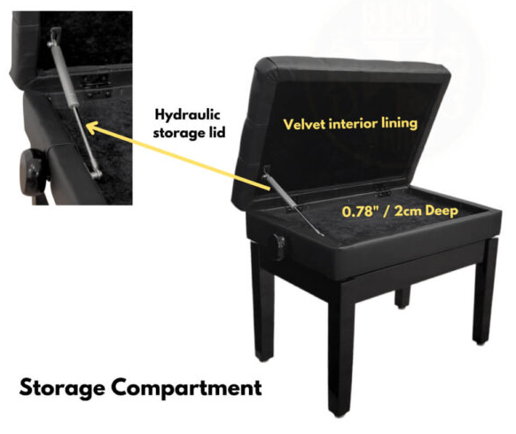 The wooden screw knob attached to the side of the bench allows for easy height adjustments. In addition, this bench includes a storage space, which is perfect for storing sheet music, music books, piano accessories, or other essentials.