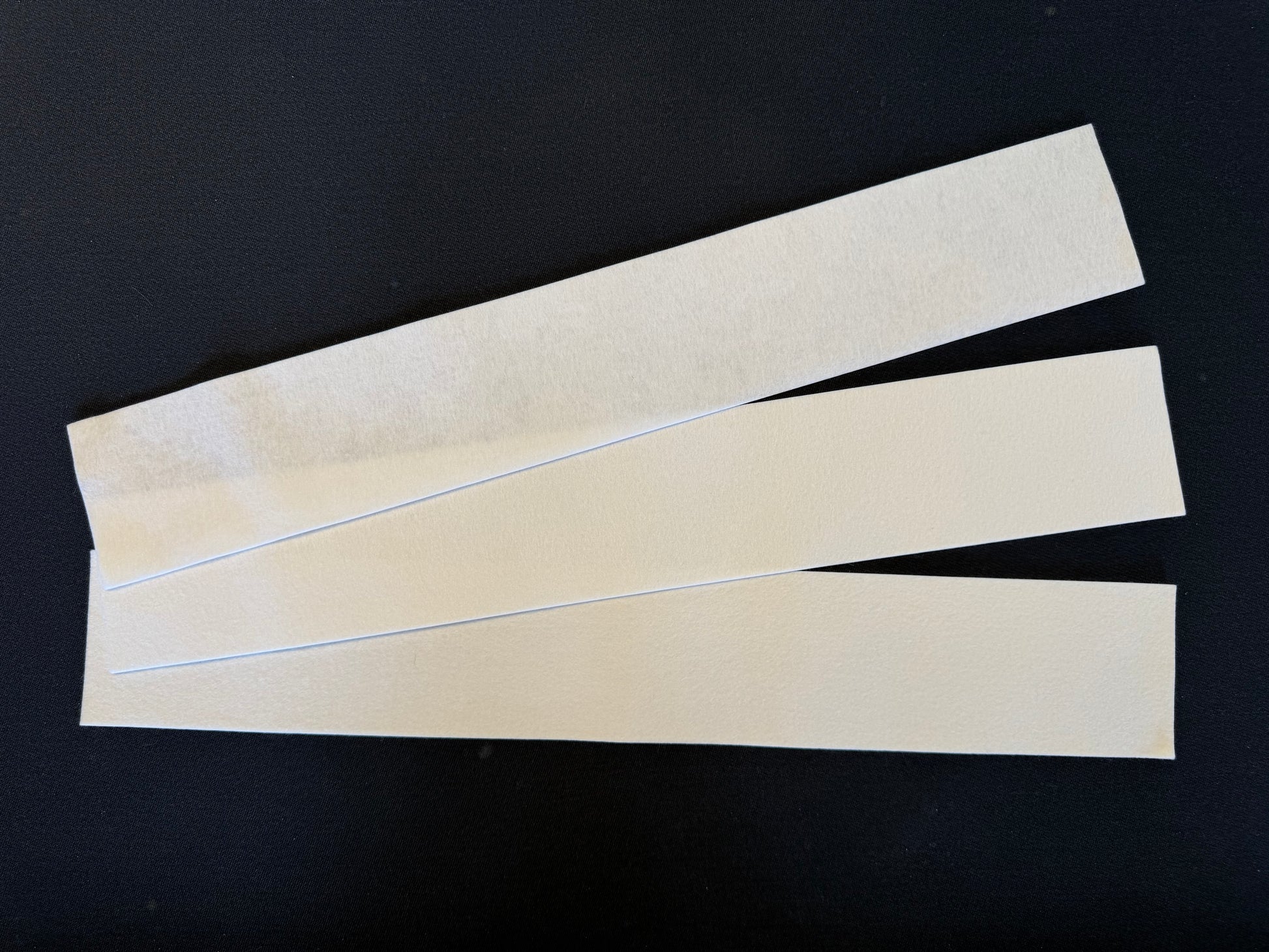 High quality, soft white felt for mute rail. Set of 3 pieces (enough for one piano). Each piece measures 3-1/8" wide x 19-1/2" long. You will receive one each of these thicknesses: .037", .055", and .075"