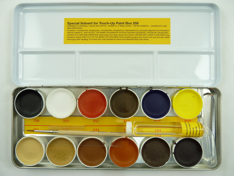 Basic set of touch-up product, colour pigments bound in resin, soluble with cellulose thinner KO710, resistant to light, suitable for all furniture surfaces. Colours; black, white, red, blue, yellow and 7 wood colors.