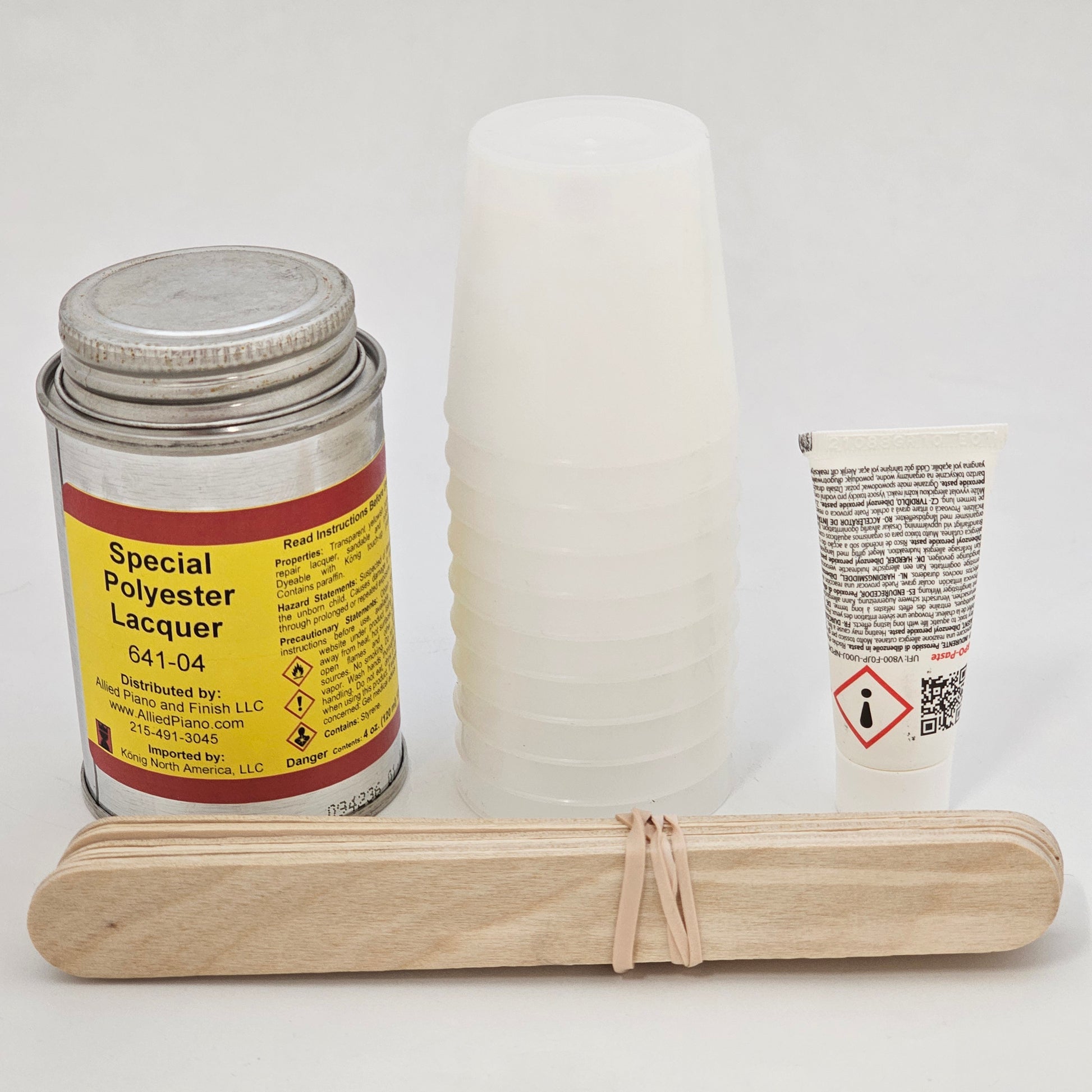 KO641-kit. Our basic polyester repair kit includes 100 ml Special Polyester Lacquer, 10 grams Hardener Paste, 10 Plastic Mixing Cups and 20 Wooden Mixing Spatulas. Used to repair all damaged polyester surfaces. Great for refilling pressure marks, fine scratches, small holes, broken corners and edges. Comes with instructions. Transparent, ready for sanding after 20 Minutes and Low Shrinkage Rate.